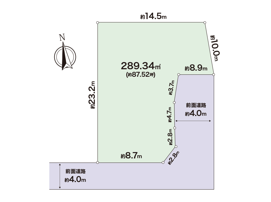 | 接道状況 | 南側:約4.0m、東側:4.0m | 土地権利 | 所有権 | ||||||||||