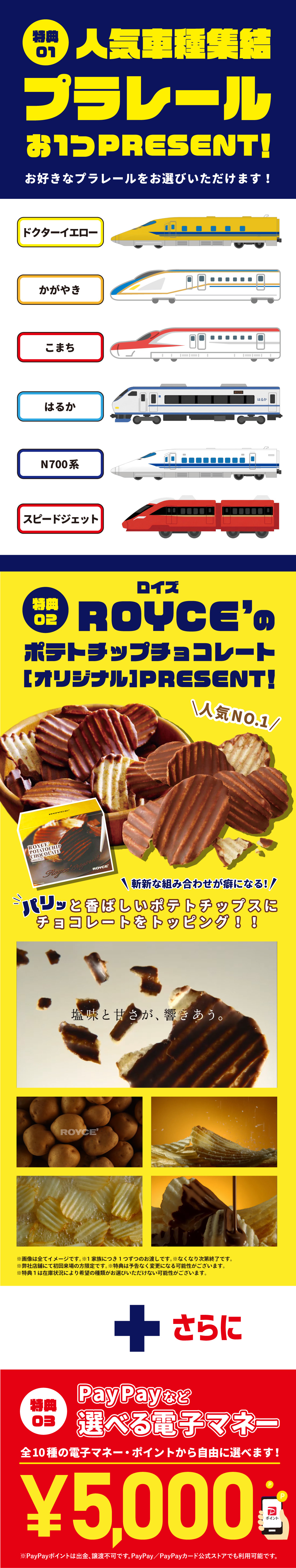 【WEB限定|桧家花博】選べるプラレールPRESENT♪さらに今なら、「ロイズ」ポテトチップチョコレートと選べる電子マネー5,000円分ももらえる!