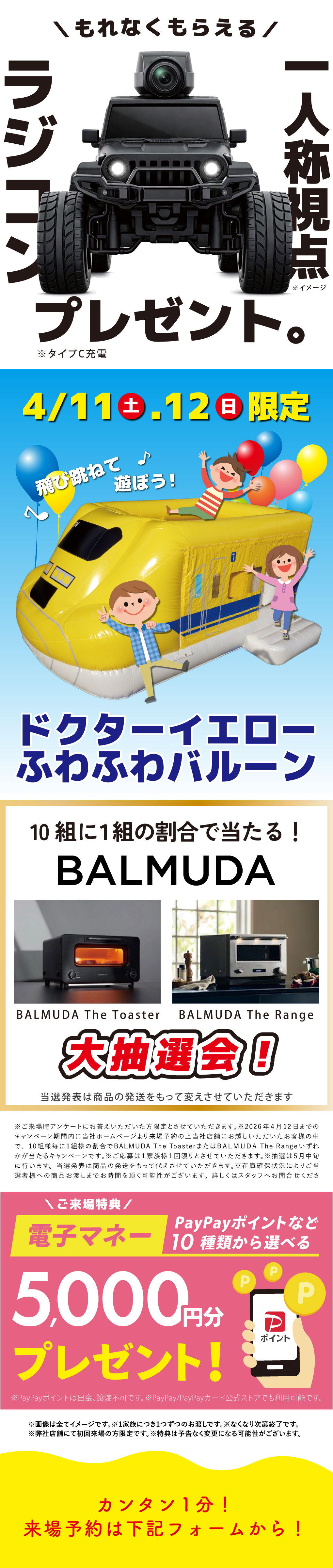【WEB限定|桧家花博】ドクターイエローのふわふわバルーンでぴょんぴょん跳んで遊ぼう!さらに今だけ、ラングラーのカメラ付ラジコンがもらえる!贅沢な住まいフェアへぜひお越しください!