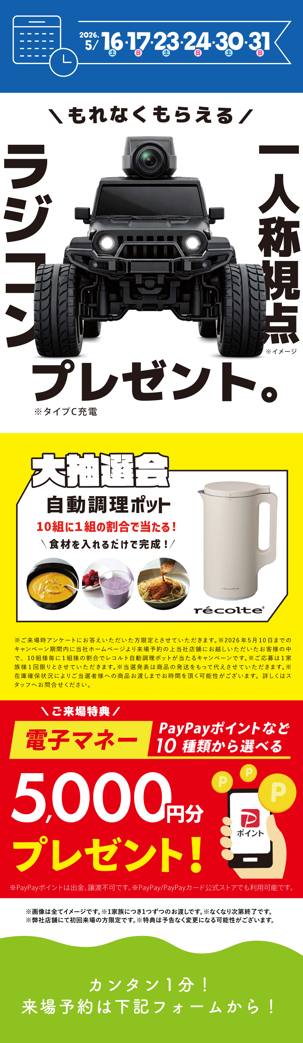 【WEB限定】FVPカメラ付ラジコンがもらえる!さらに今だけ、レコルト自動調理ポットが抽選で当たる?!ぜひお越しください!at 桧家花博